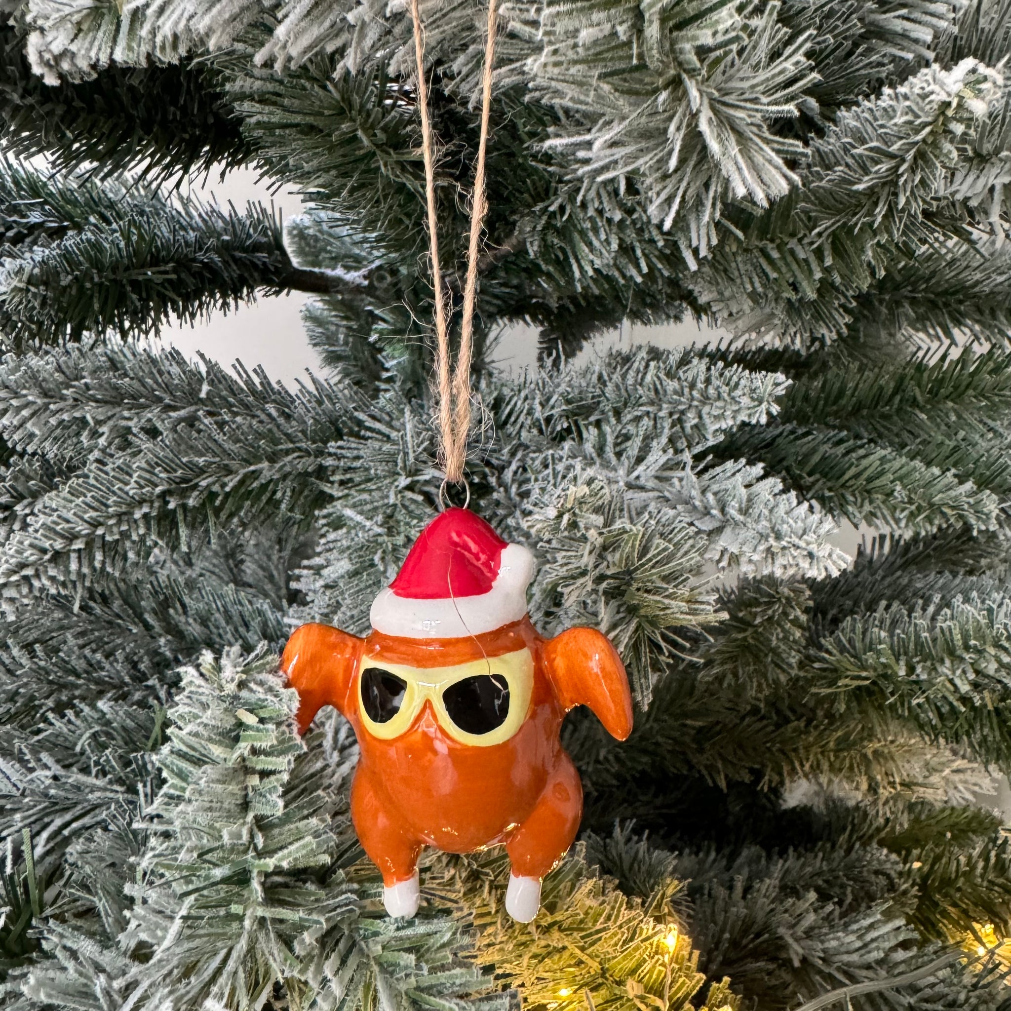 Our best selling collection of ceramic quirky Christmas decorations! Fun hanging turkey wearing a santa hat & sunglasses, can be hung from your tree for a unique twist or as a fun gift.