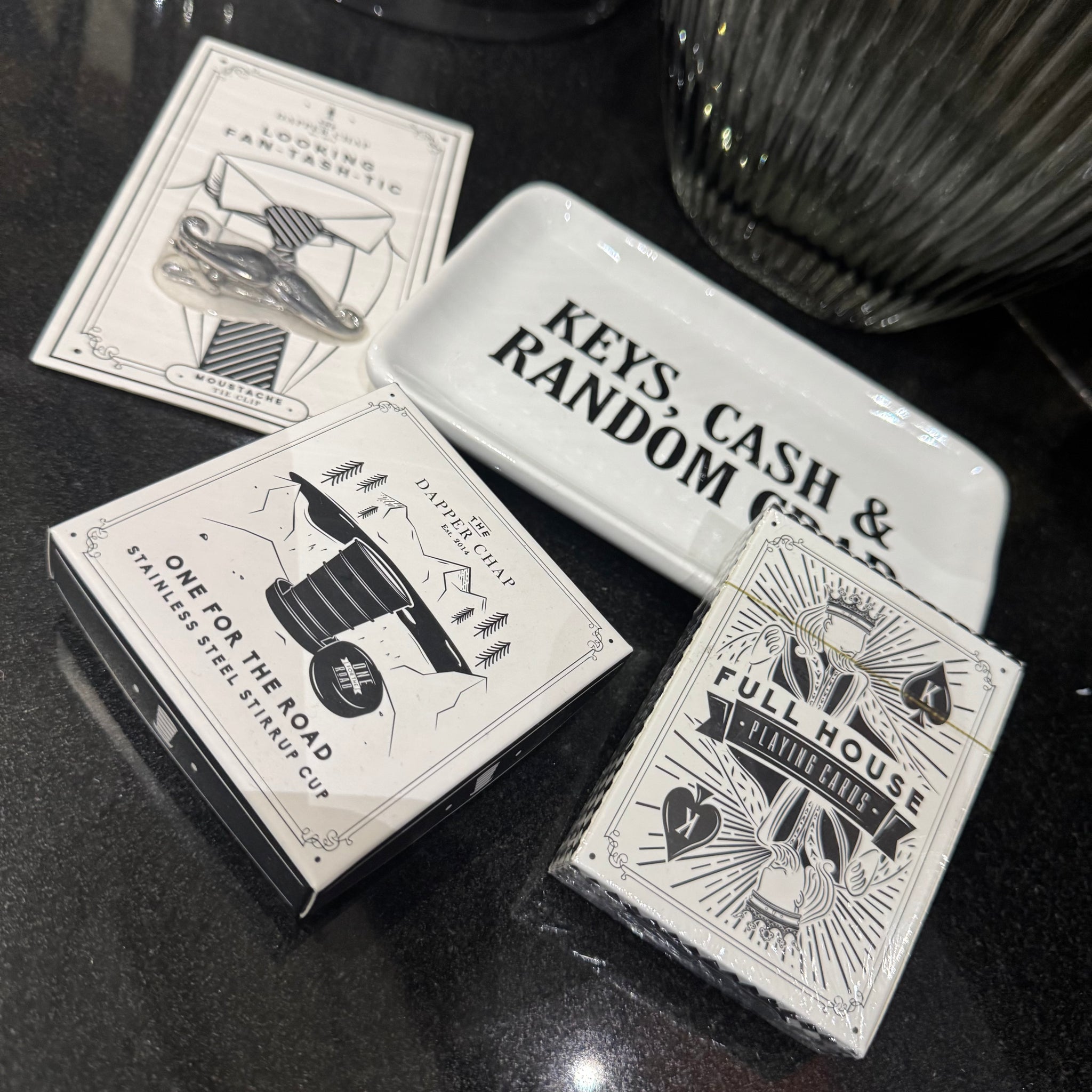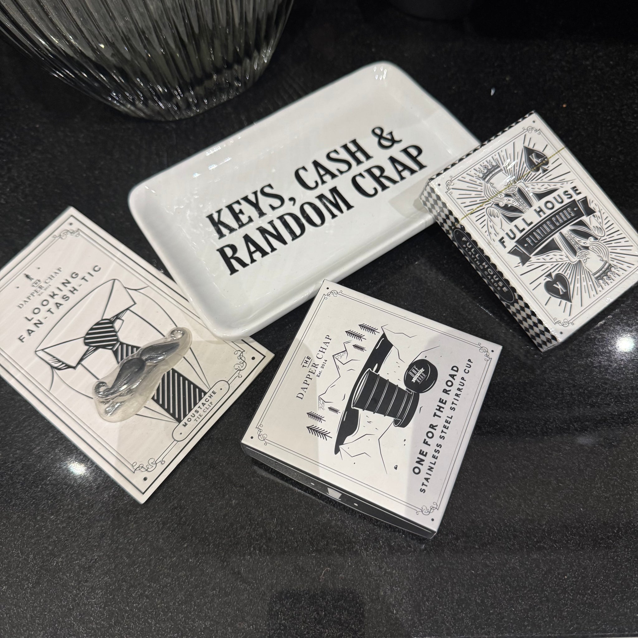- White Ceramic Small 16.5x10cm Dish with a quote in black text; 'Keys, Cash & Random Crap'