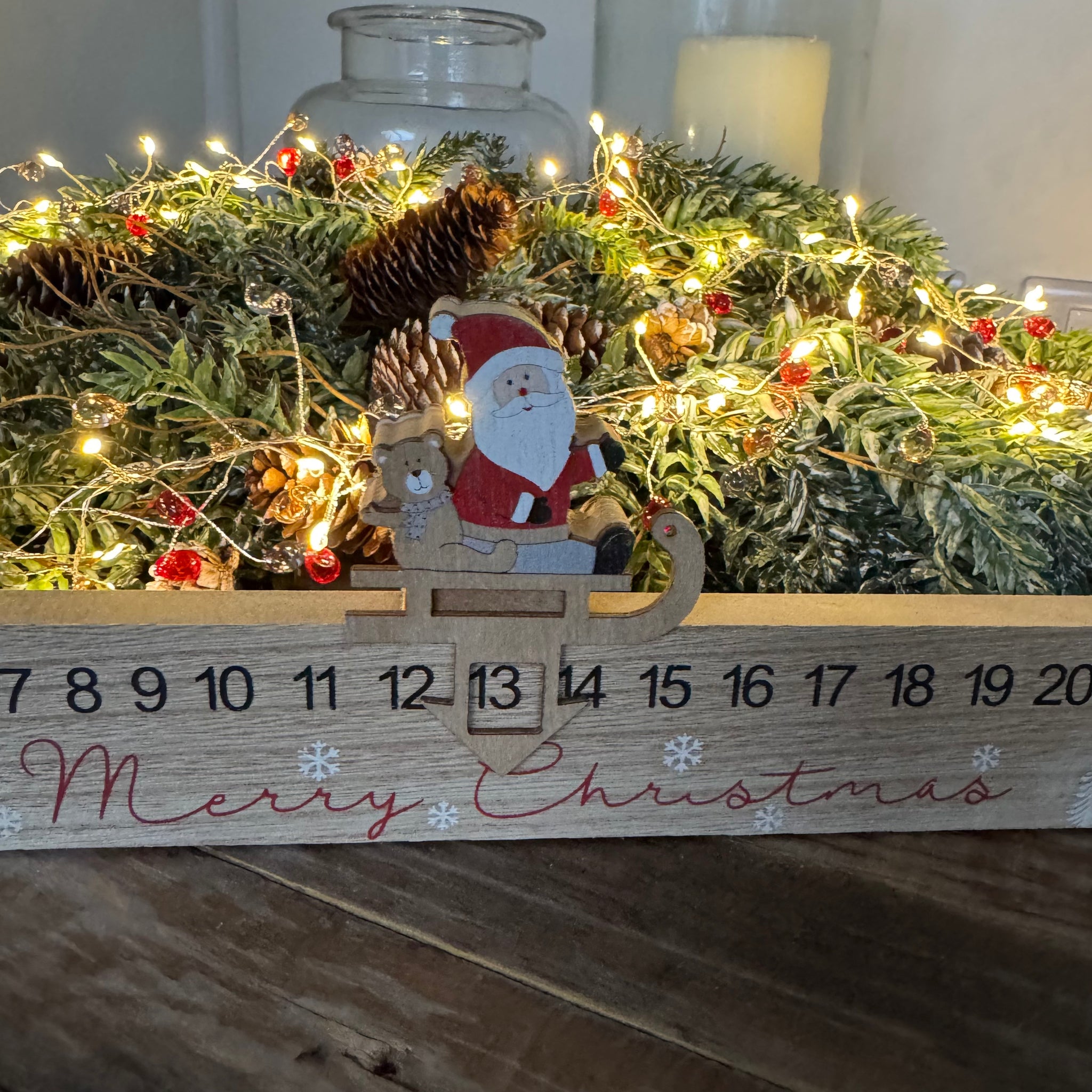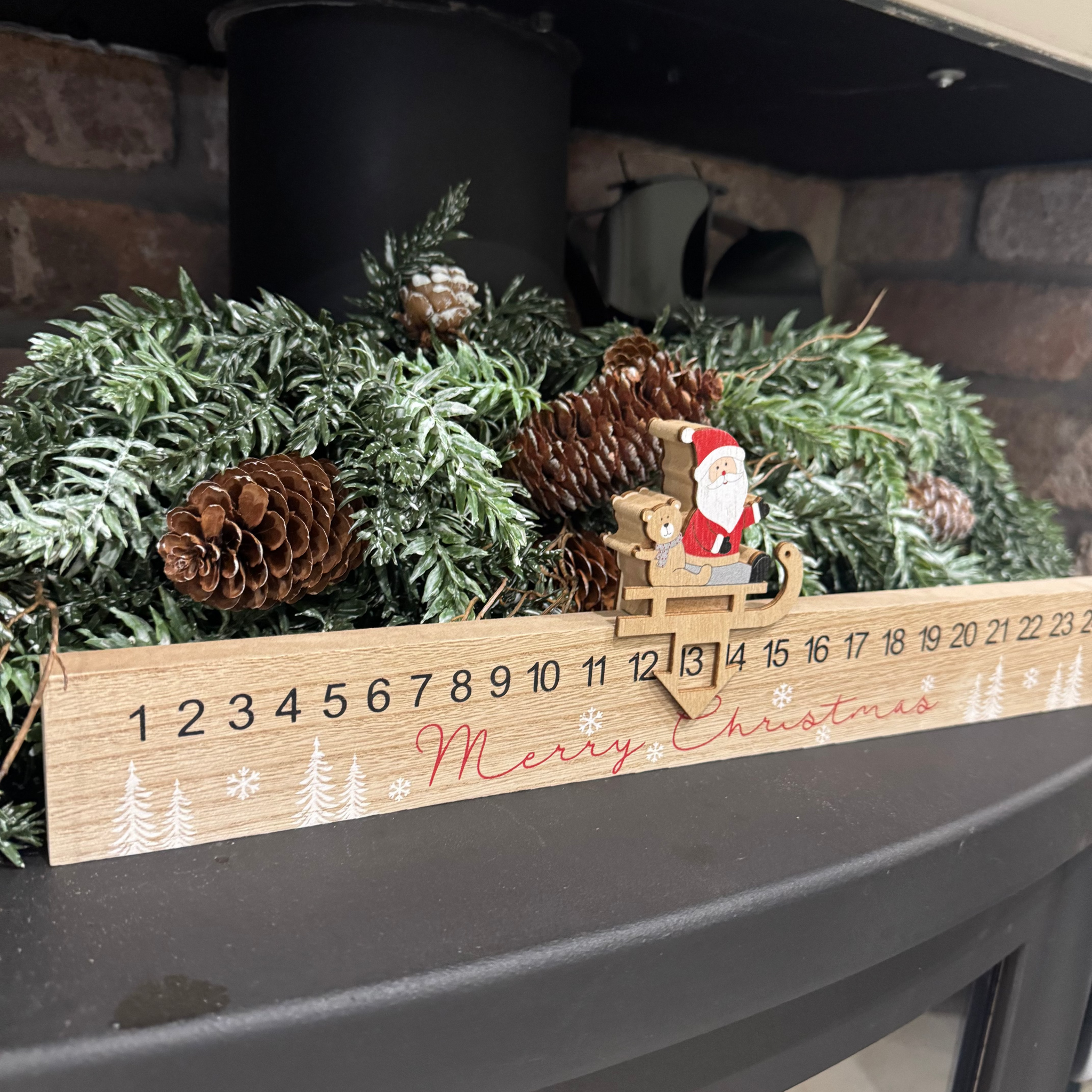 Long Wooden L39.5cm Advent Calendar Counter with Santa on a sleigh Marker to count the days down