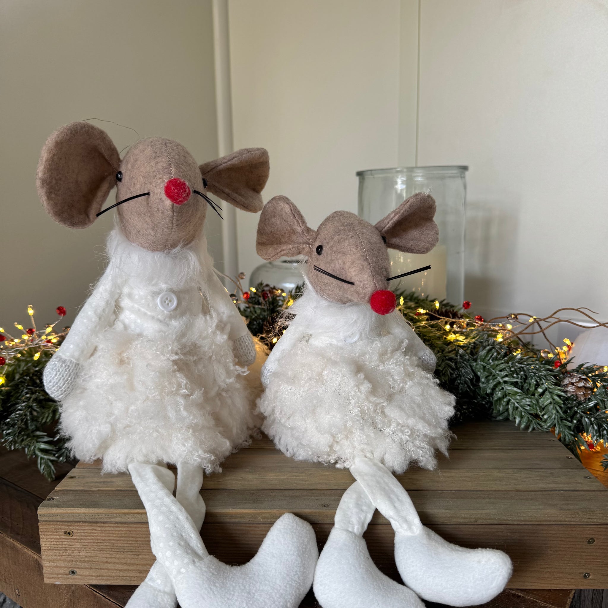 Fabric Sitting Mouse in white dress with dangly legs - 2 sizes