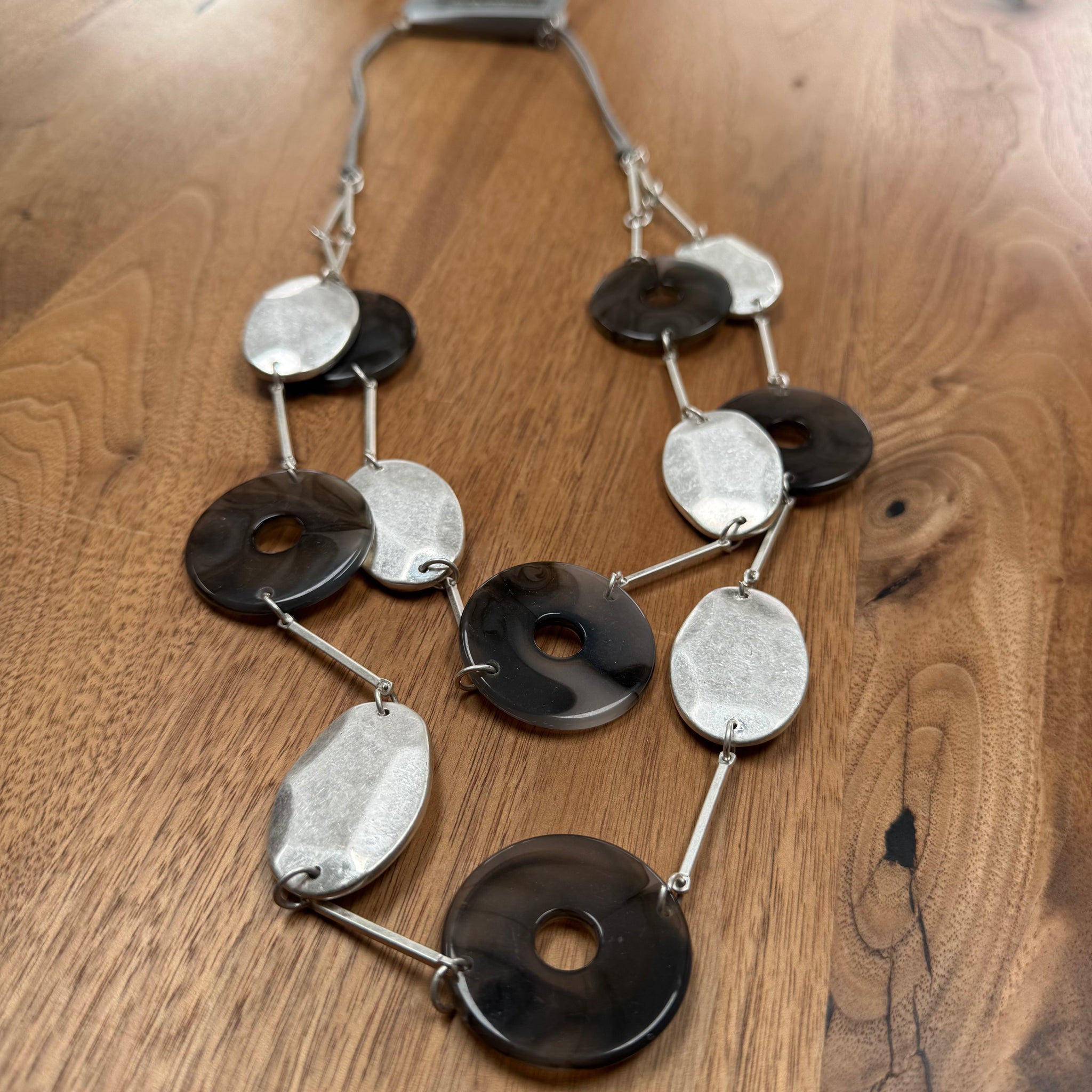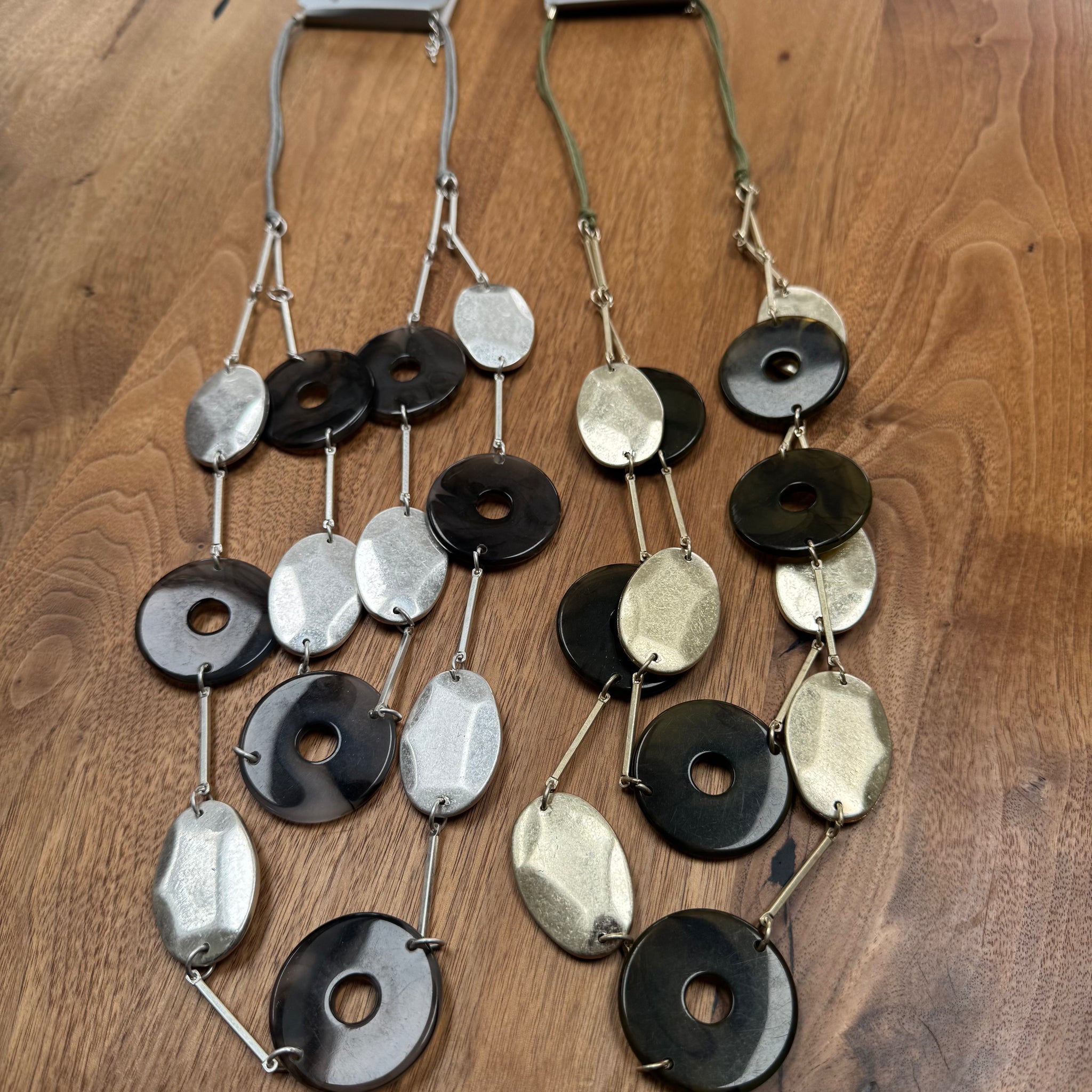 This striking double-strand statement necklace seamlessly blends natural and industrial elements. It features a curated mix of glossy resin round discs and sleek metal oval discs, all intricately hand-strung on textured grey twine. The two-tier design offers a modern, layered look with a tactile, artisan feel