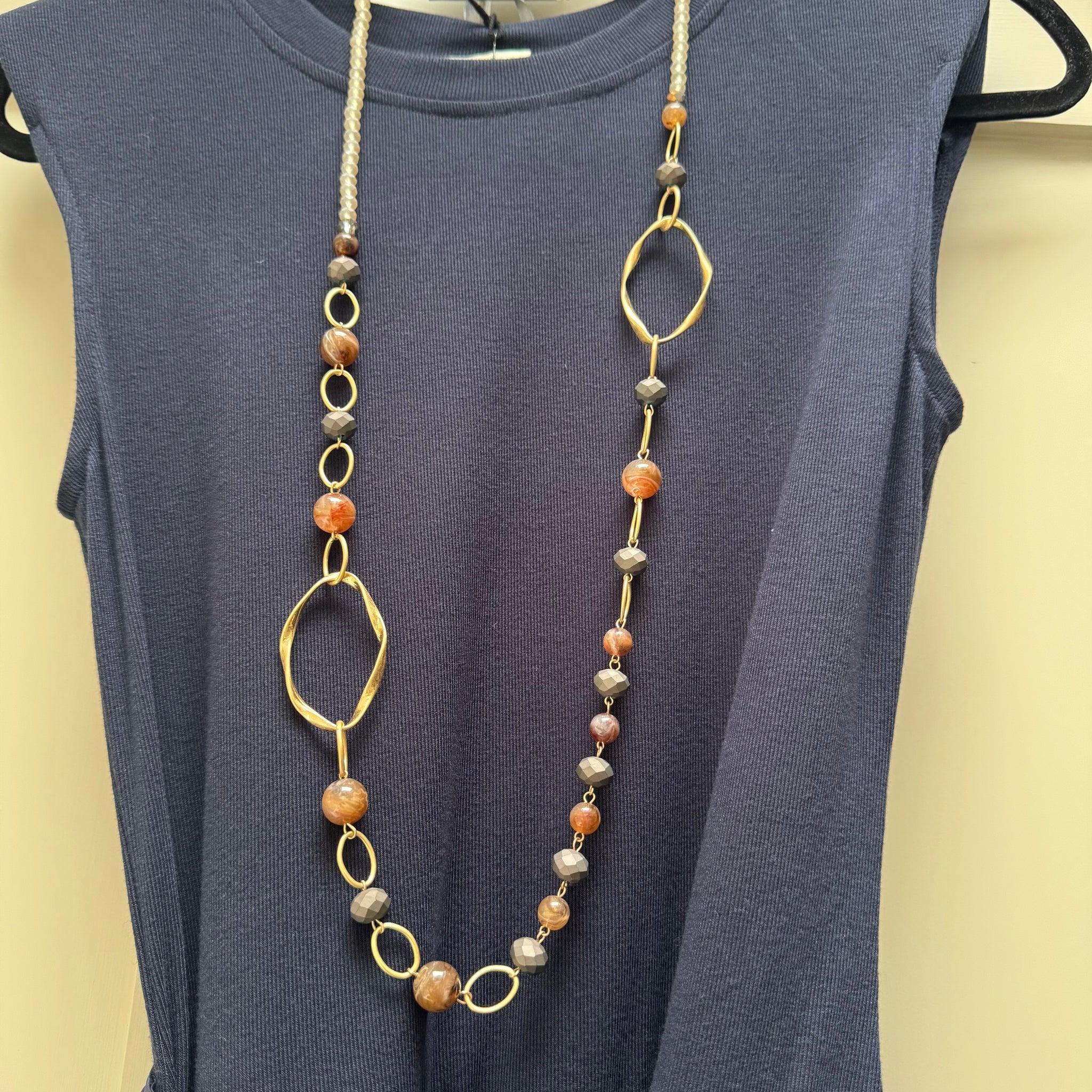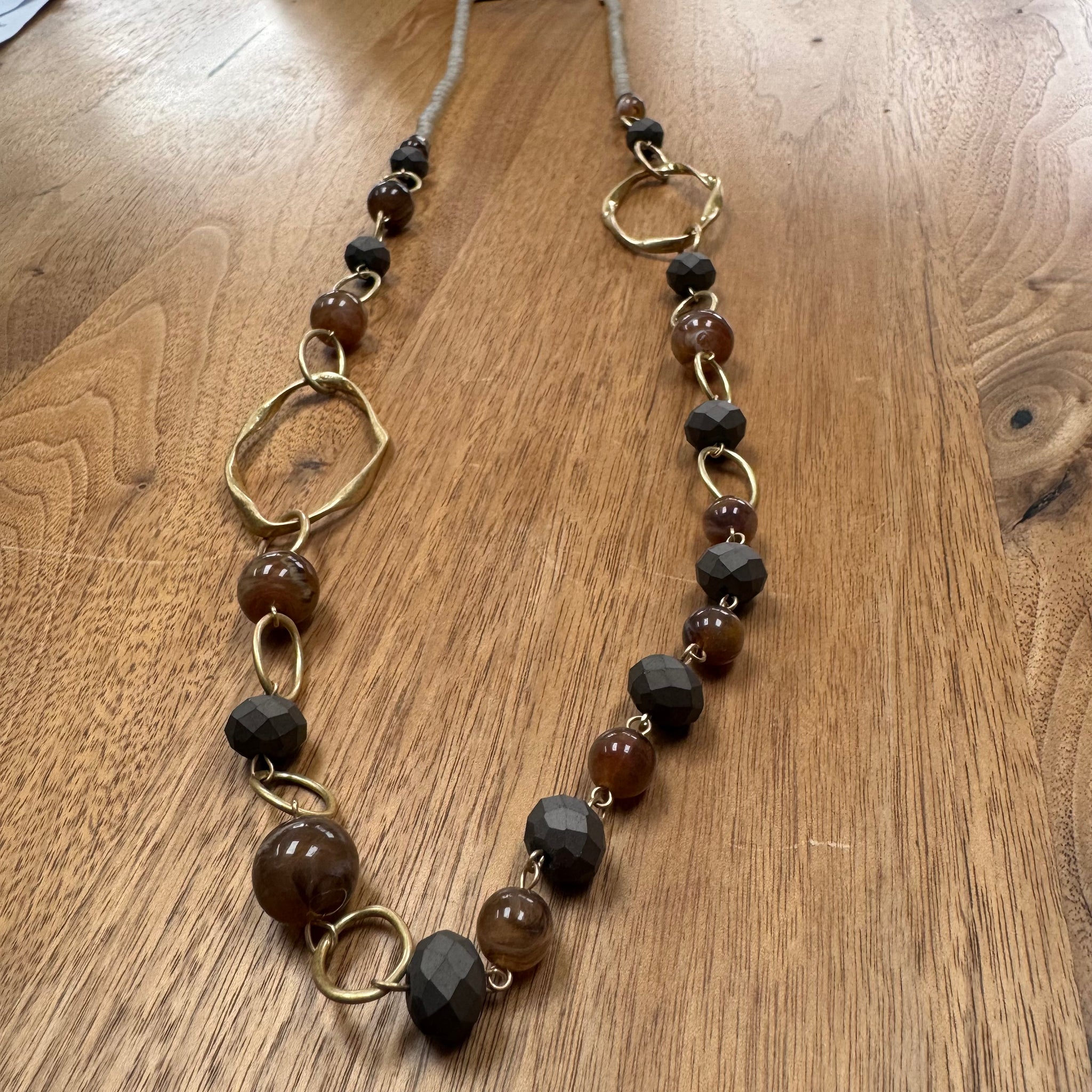 Eliza Gracious - Matt Brown beaded & matt gold links long necklace