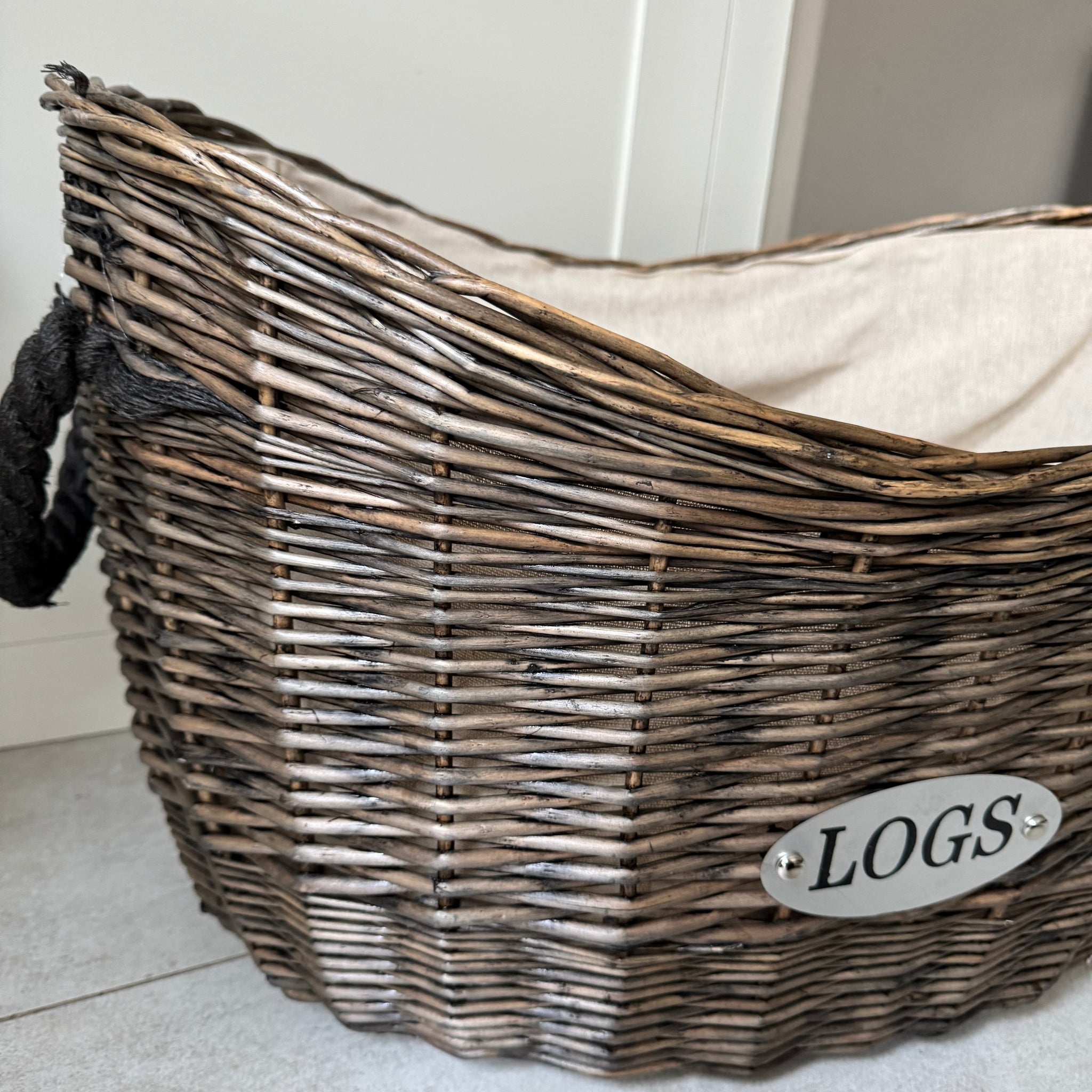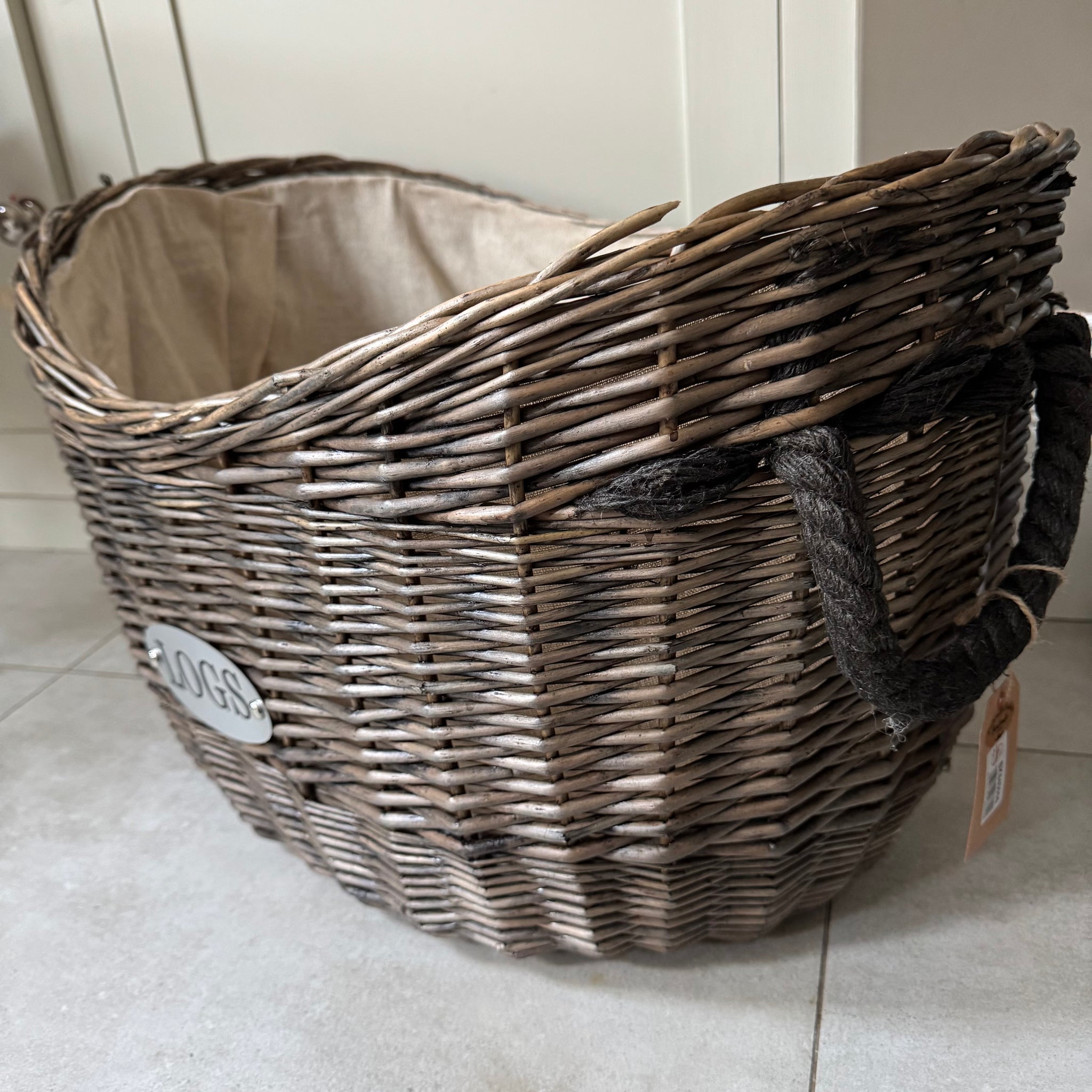 It has two chunky rope handles on the sides and has a metal oval 'LOGS' sign on the front.