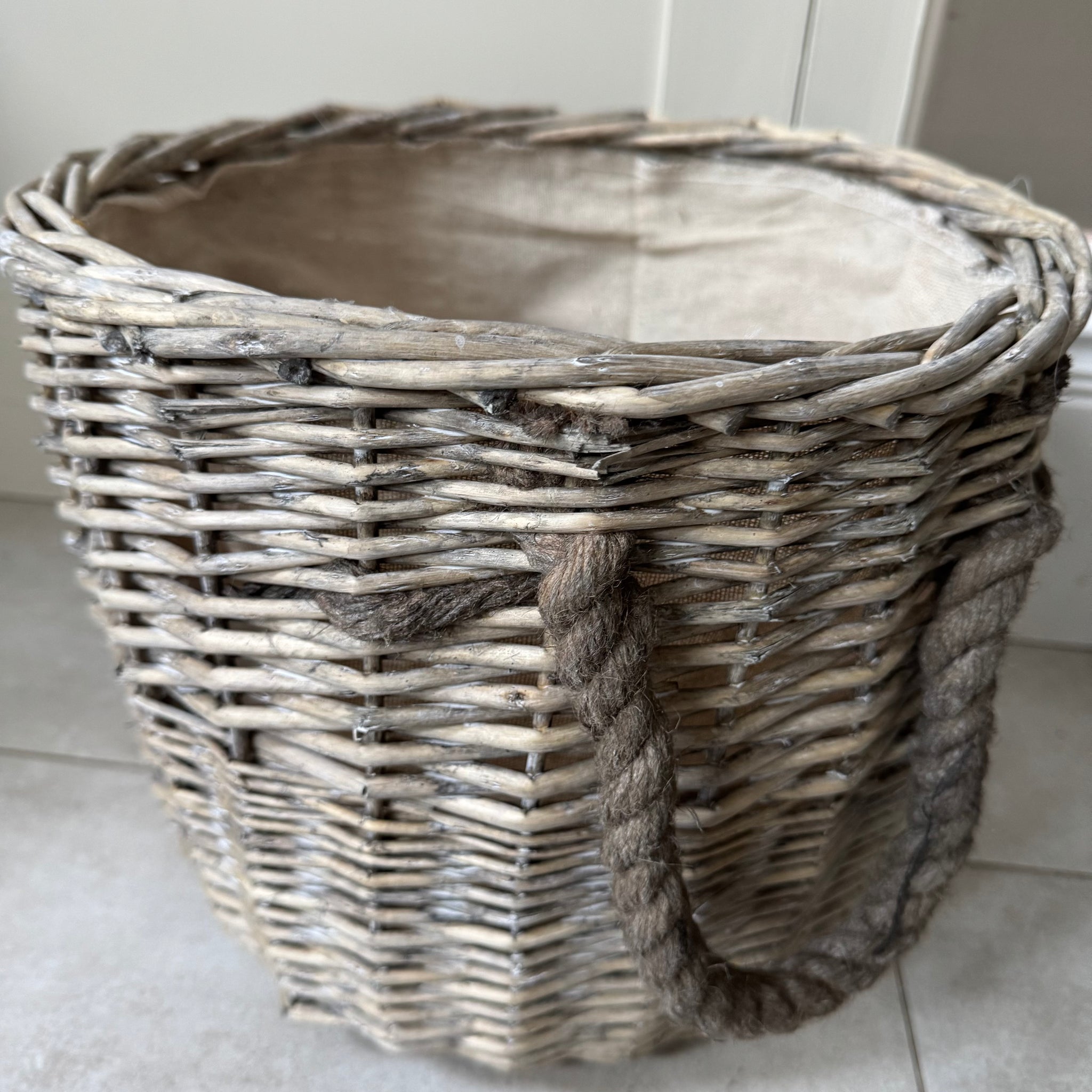 Small Round Log Basket with two rope handles & full lined with Hessian fabric  32x27x22cm