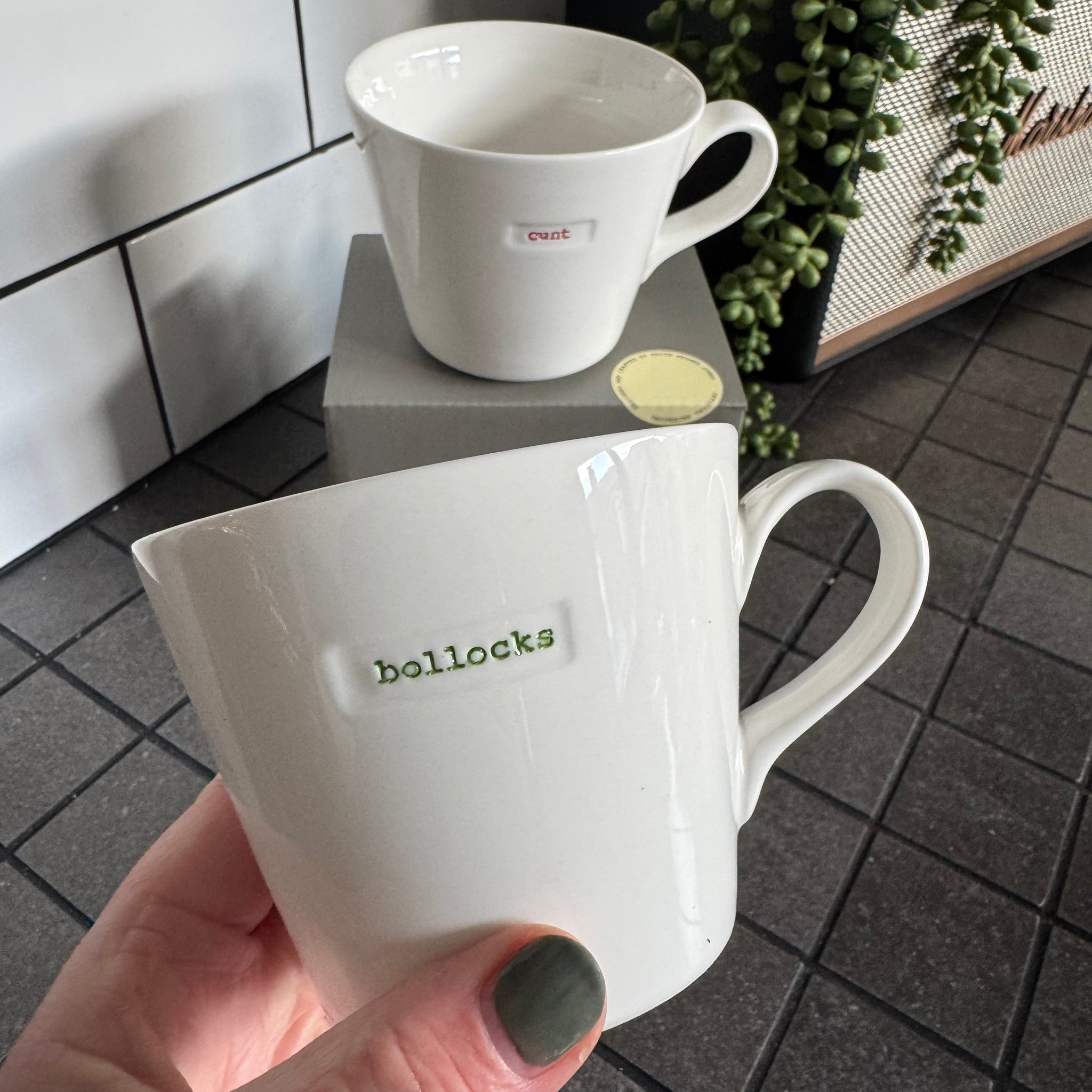 The classic expletive is subtly hand-stamped in green typewriter font onto white porcelain - perfect for good-natured complaining.