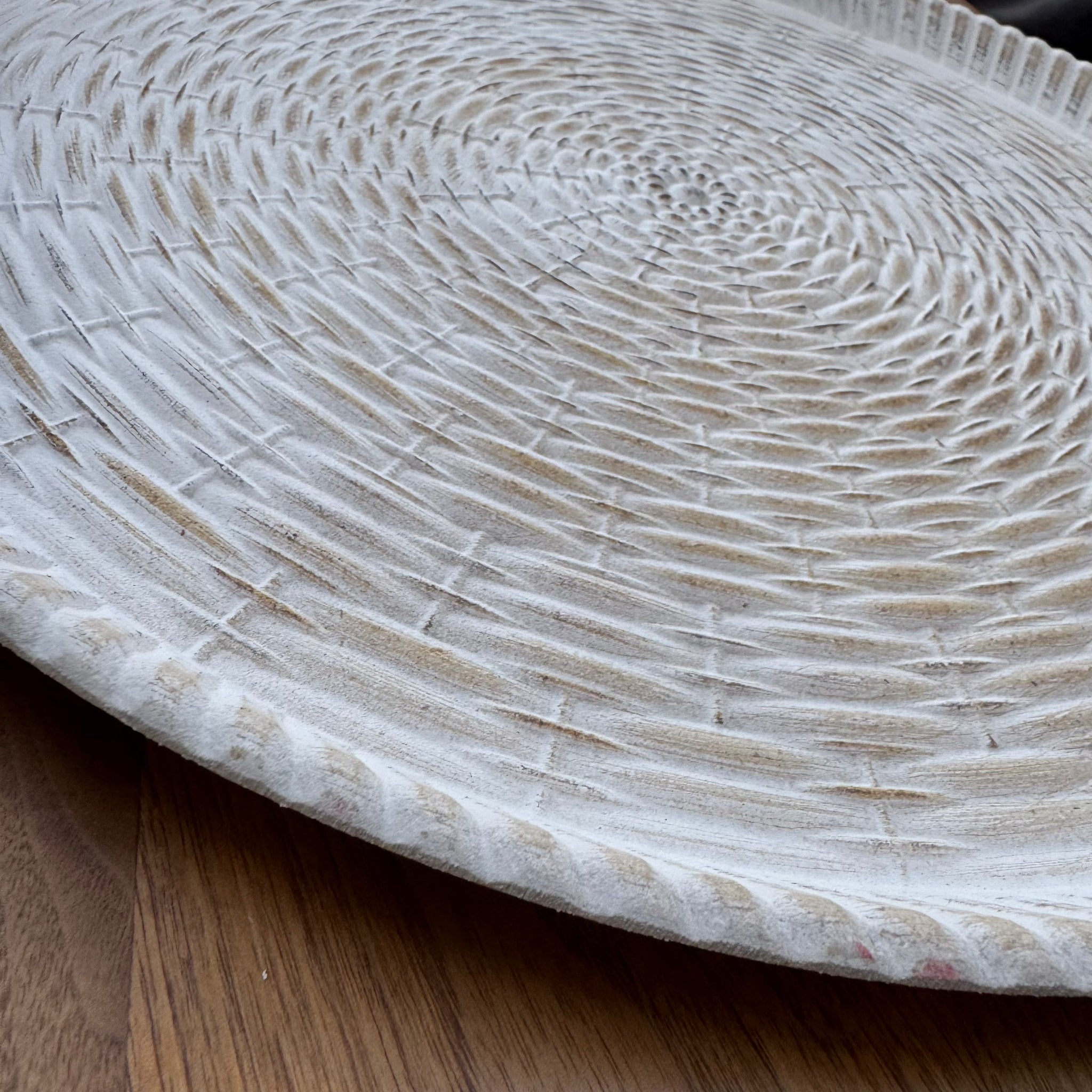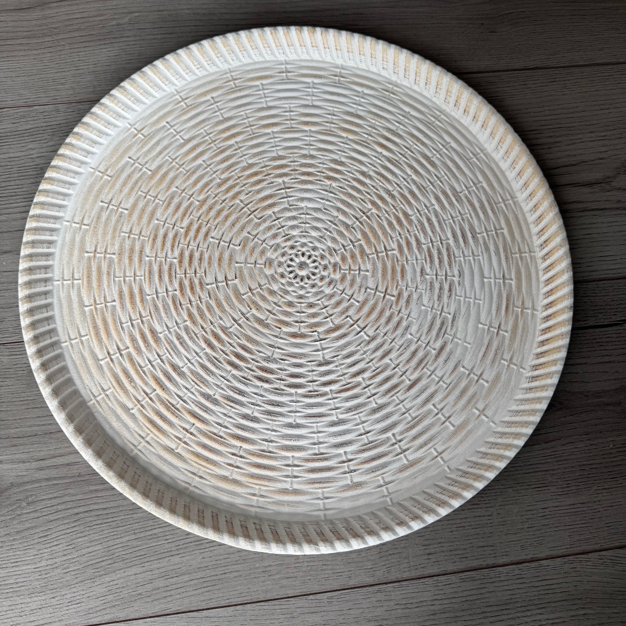 Whitewashed Neutral Round distressed Bamboo wooden tray with basket weave design, approx 39cm diameter