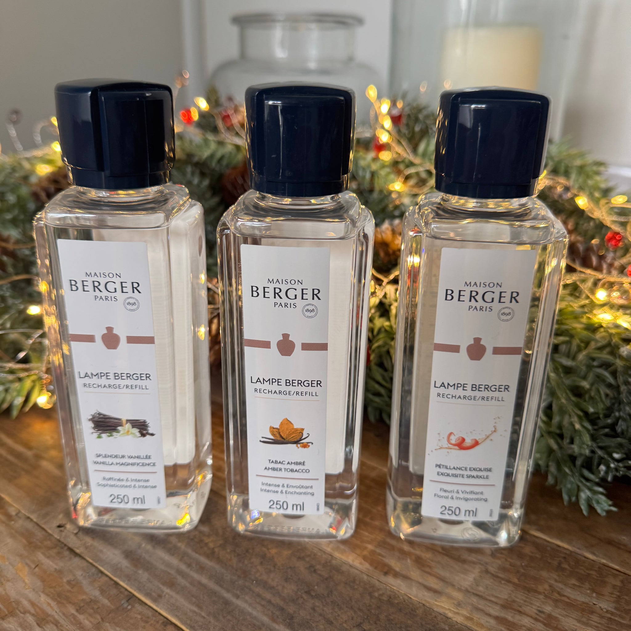 Refresh your scented experience with the Rosalie triopack, featuring three 250ml refills—ideal for creating a variety of moods at home. The Triopack Rosalie Lamp Berger Refills 250ml brings together three signature fragrances: Vanilla Magnificence, Amber Tobacco and Exquisite Sparkle. Each fragrance has been selected to offer a sophisticated and varied olfactory journey, delicately scenting and purifying your living space.This set includes three 250ml refills, providing up to 120 hours of fragrance. An elegant and practical gift idea