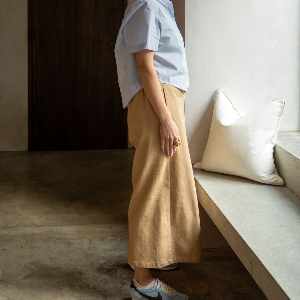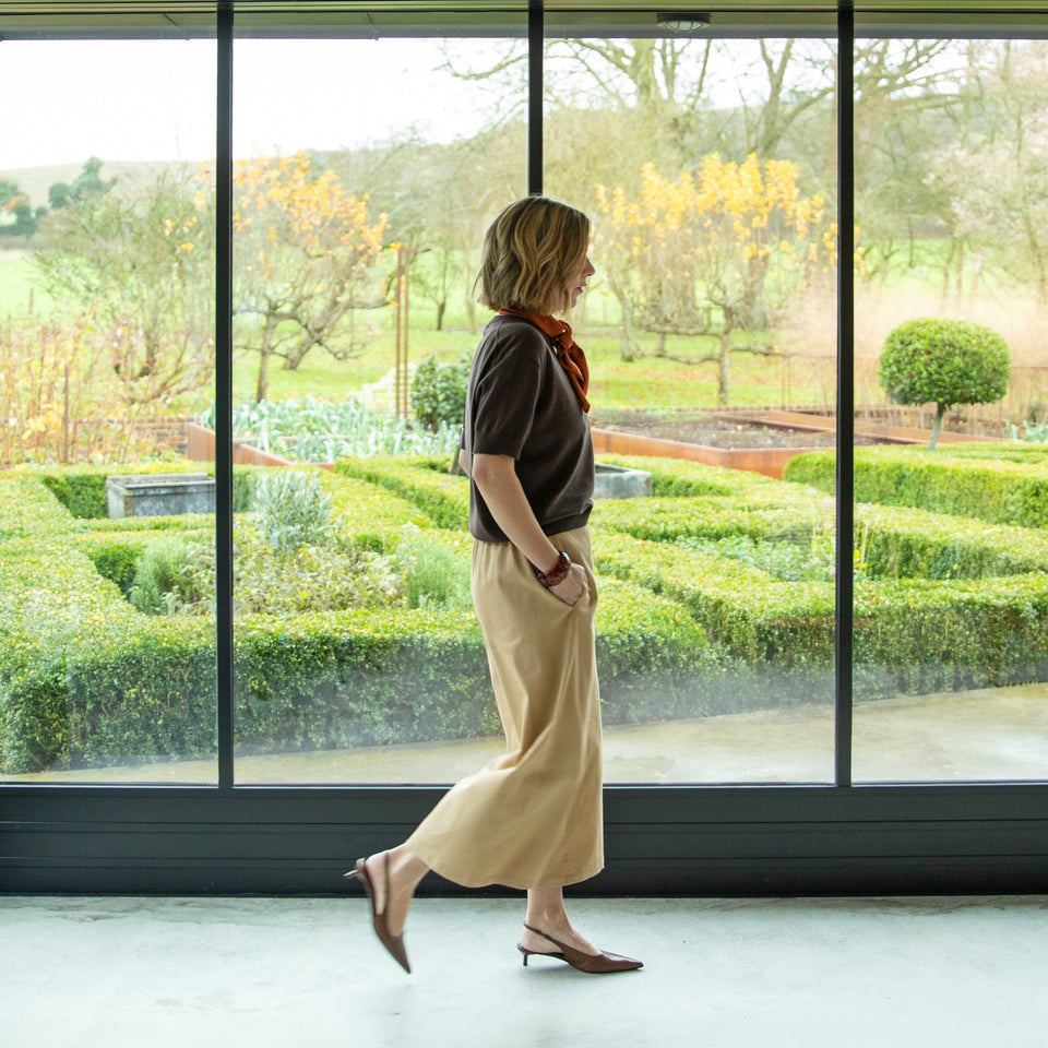 The Molly Trouser is a cropped wide-leg style with an elasticated waist and a flat front waistband for a clean look. It includes practical side pockets, combining comfort with effortless style.