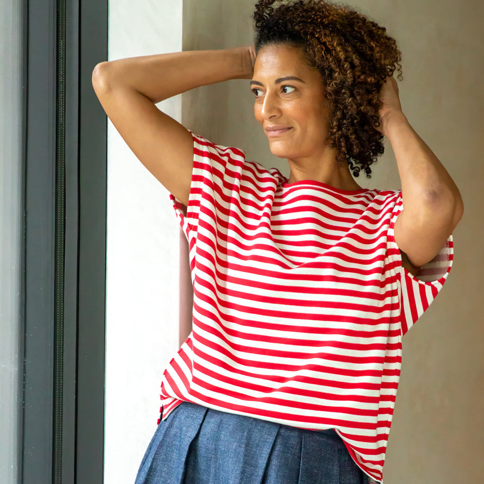 Crafted from a soft cotton blend loop-back fabric, this top features a relaxed boxy shape with a classic round neckline.