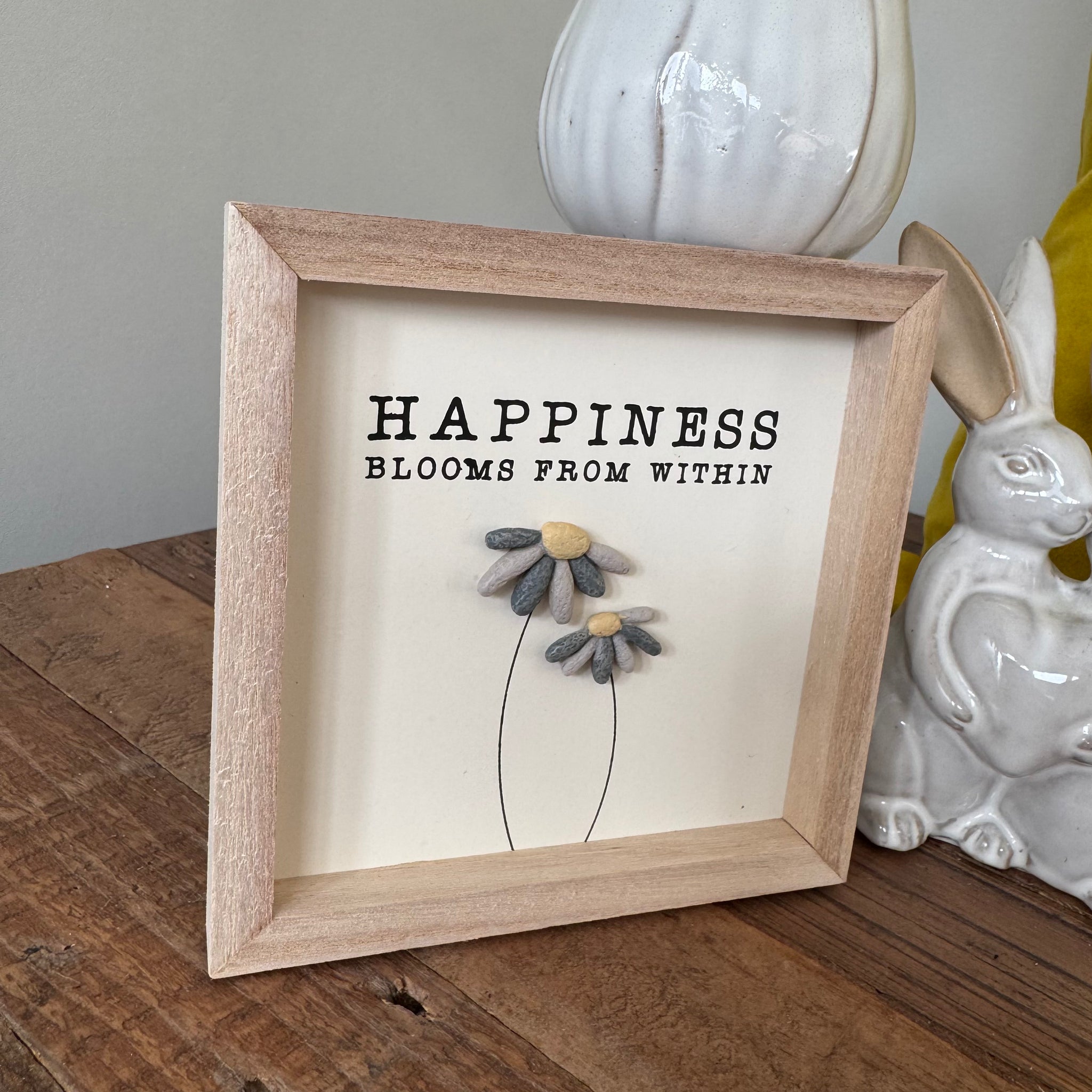 Add a touch of calm to your home with this charming happiness blooms within pebble flower sign