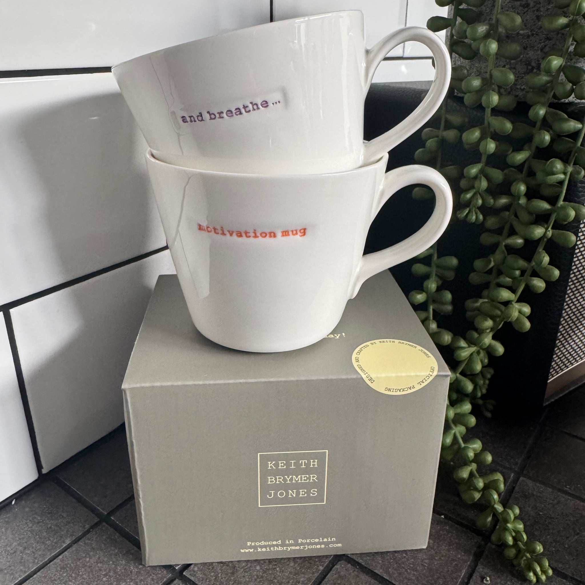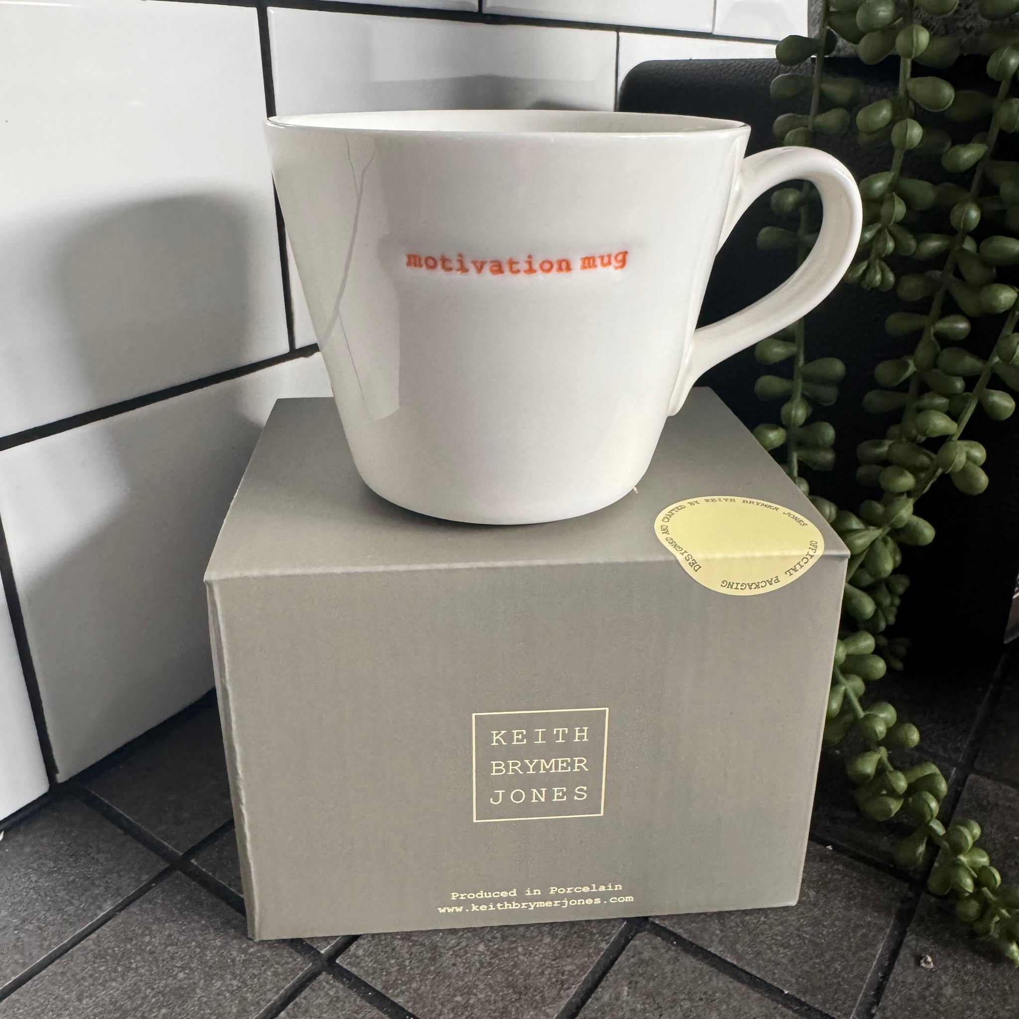 Fuel productivity with this Medium Orange Motivation Mug from Keith Brymer Jones' inspiring Word Range. The energizing phrase is hand-stamped in vibrant orange typewriter font onto white porcelain - perfect for goal-chasers.