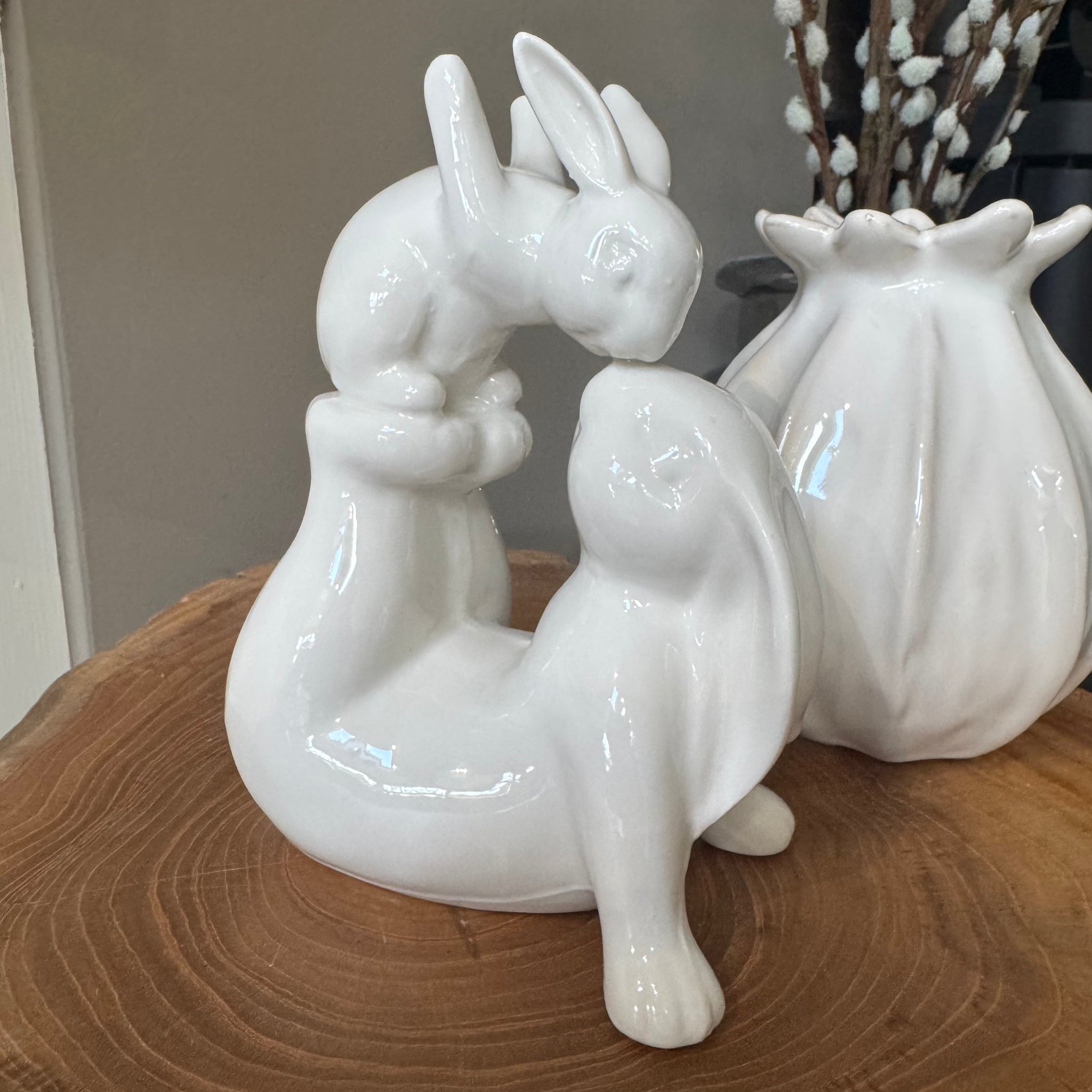 Adorable white ceramic glazed rabbits; Mum rabbit is leaning back with legs in the air and the little rabbit is balanced on top kissing mum on the nose.. A nice loving pose.