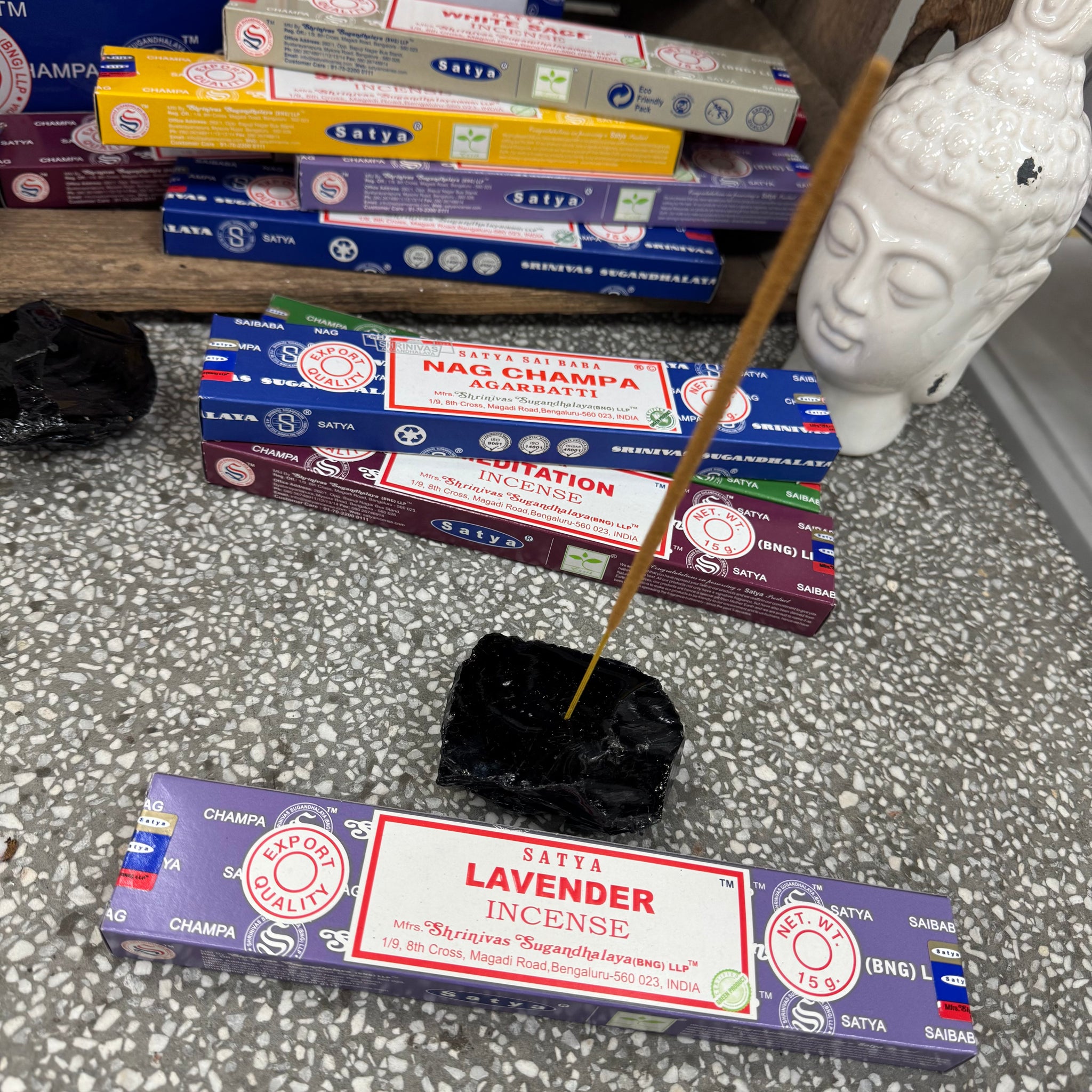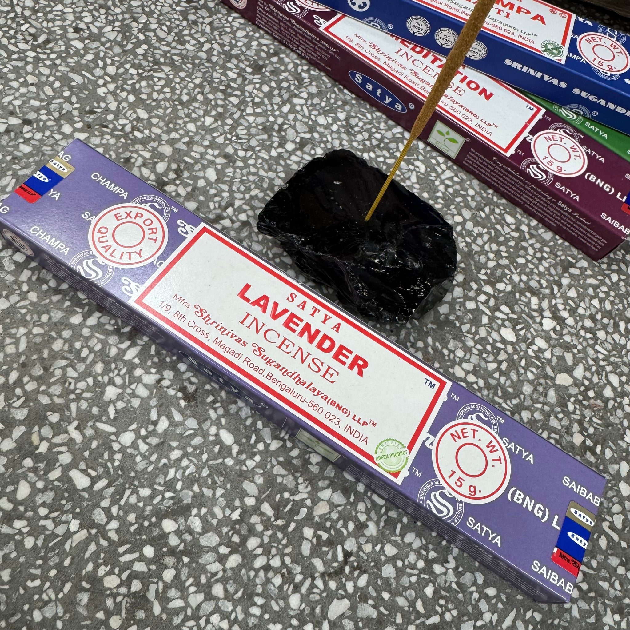 Satya Lavender incense has a soothing, floral, and slightly herbaceous scent, blending the sweet and calming aroma of lavender with underlying notes of spices and woods. It is often described as clean and fresh, yet also warm and comforting, with a fragrance that is not overpowering and is ideal for creating a relaxing atmosphere for meditation, sleep, or general unwinding. .
