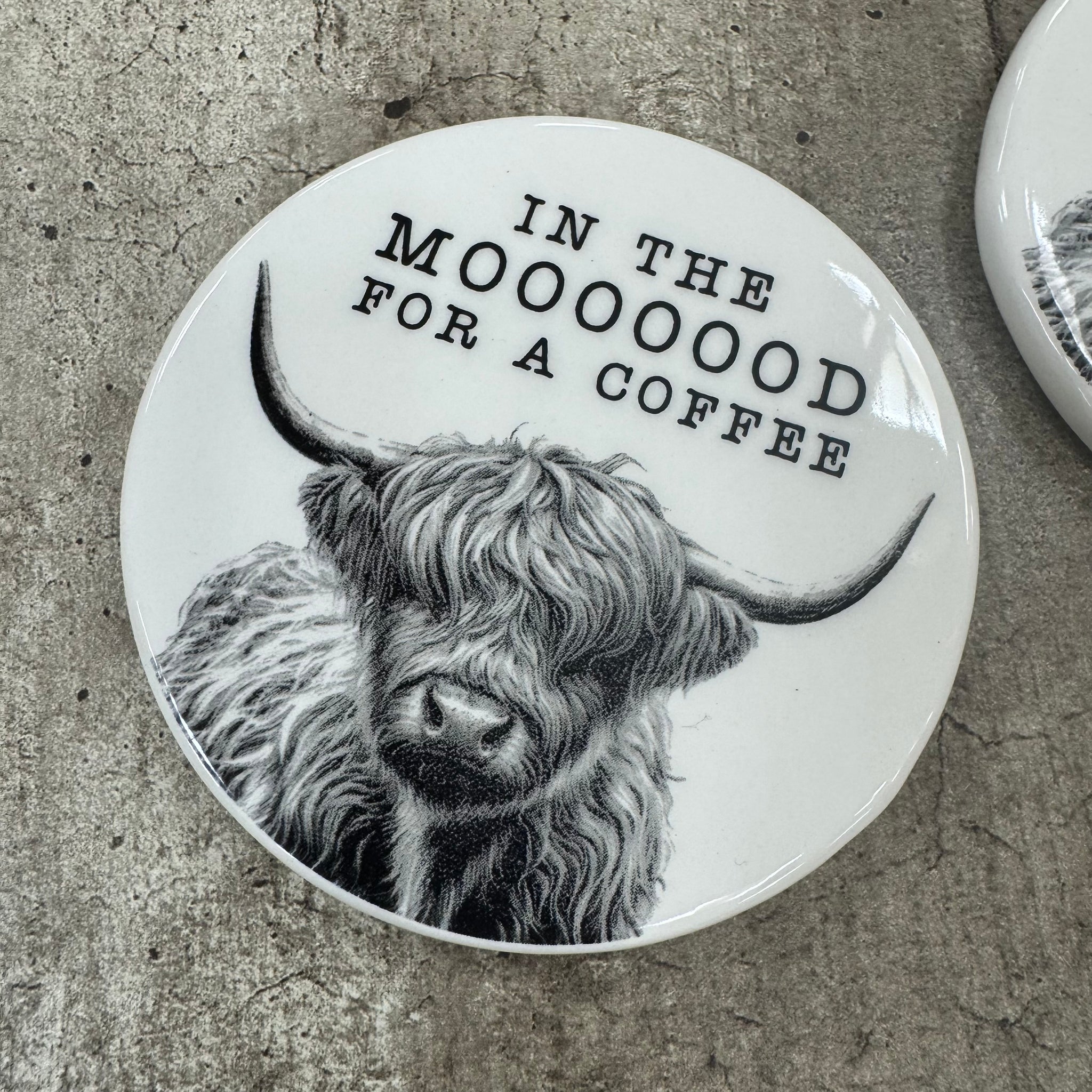 White glazed Ceramic Coaster with a black classy pencil illustration of a Highland Cow 10cm