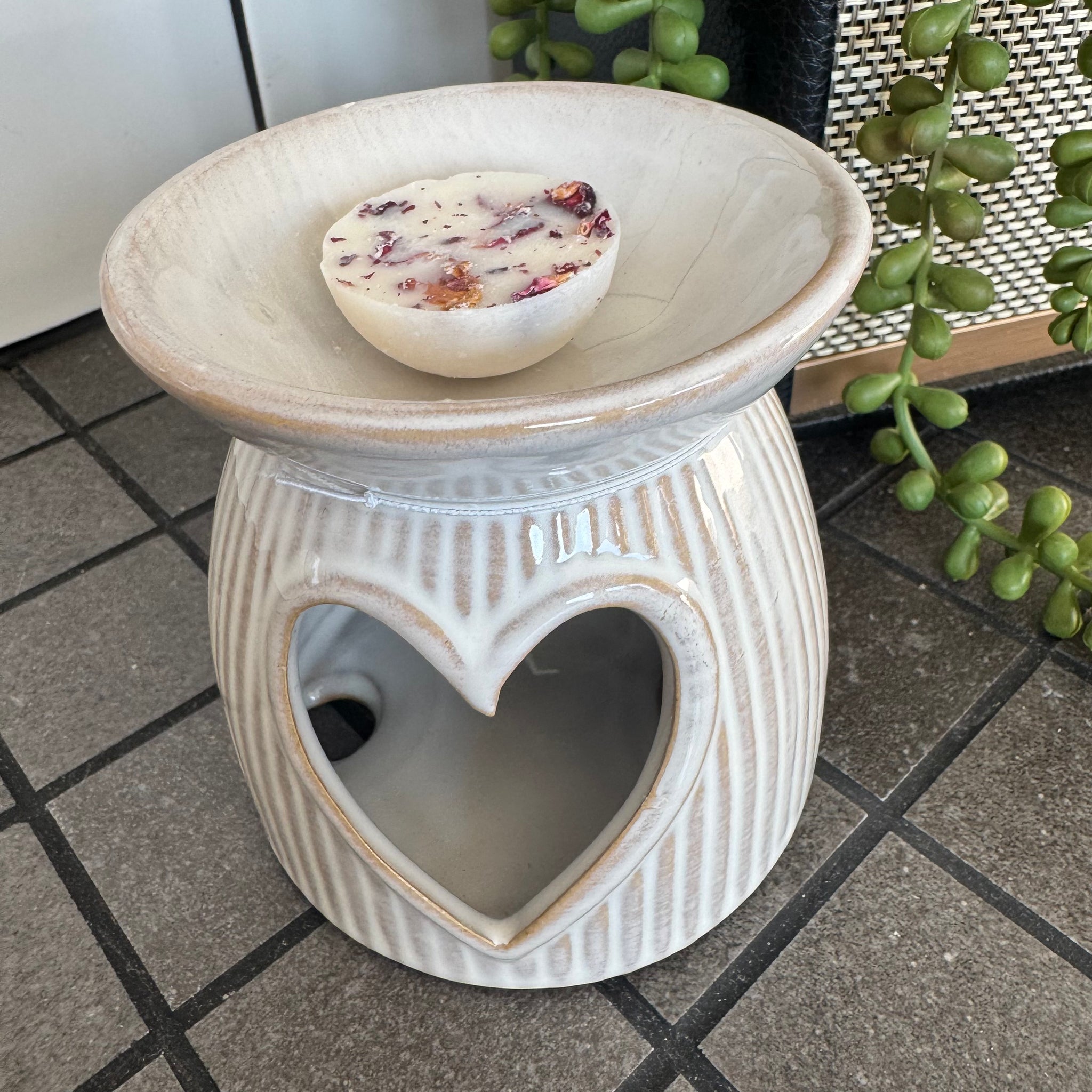 Ceramic Wax/Oil Burner 10cm in an off-white/neutral ribbed pattern and a cut out Heart Shape