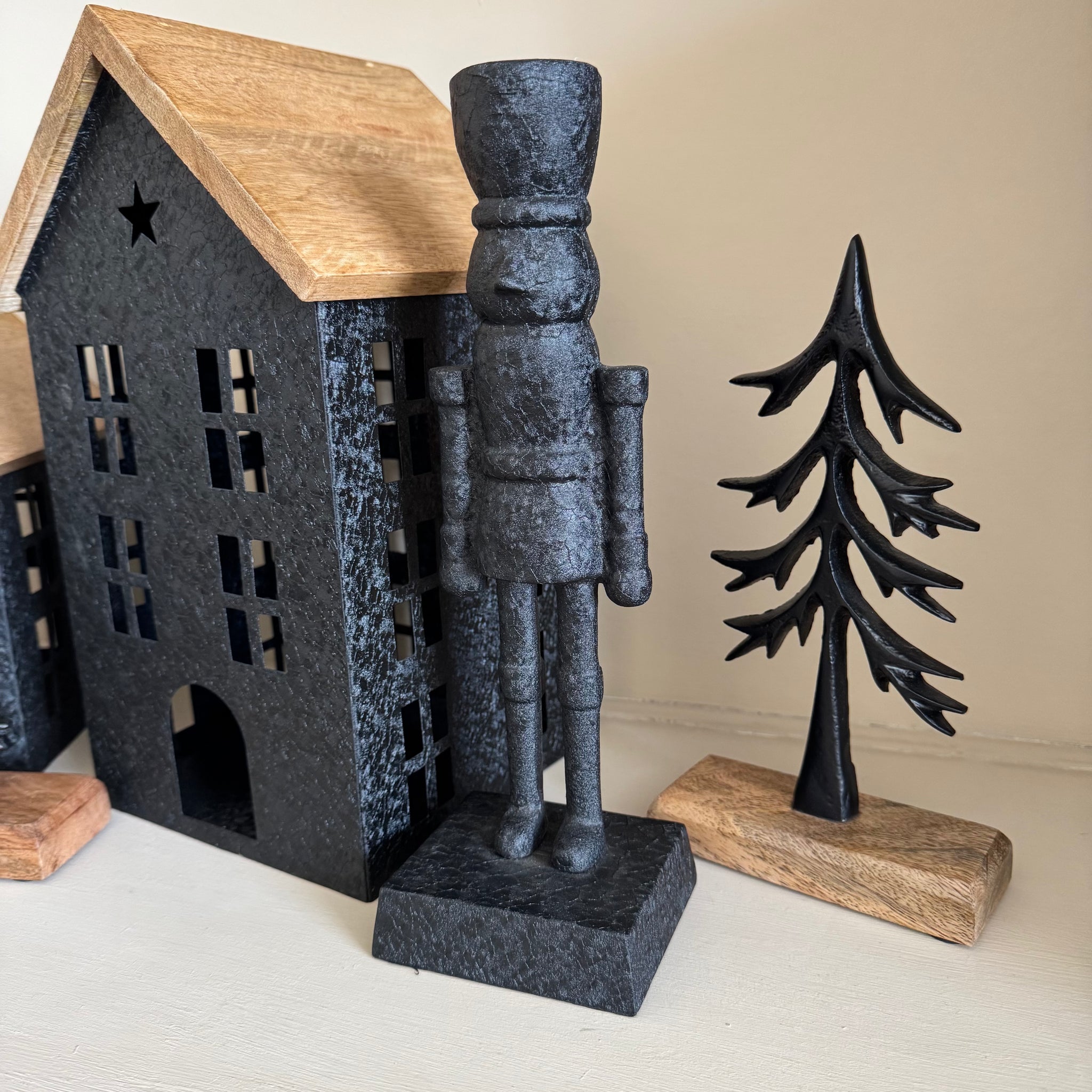 Introduce a touch of rustic elegance to any festive collection with this 28cm aluminium nutcracker ornament. With a sleek black finish, this timeless piece is the perfect addition to any Christmas home decor, adding a touch of rough luxe charm.