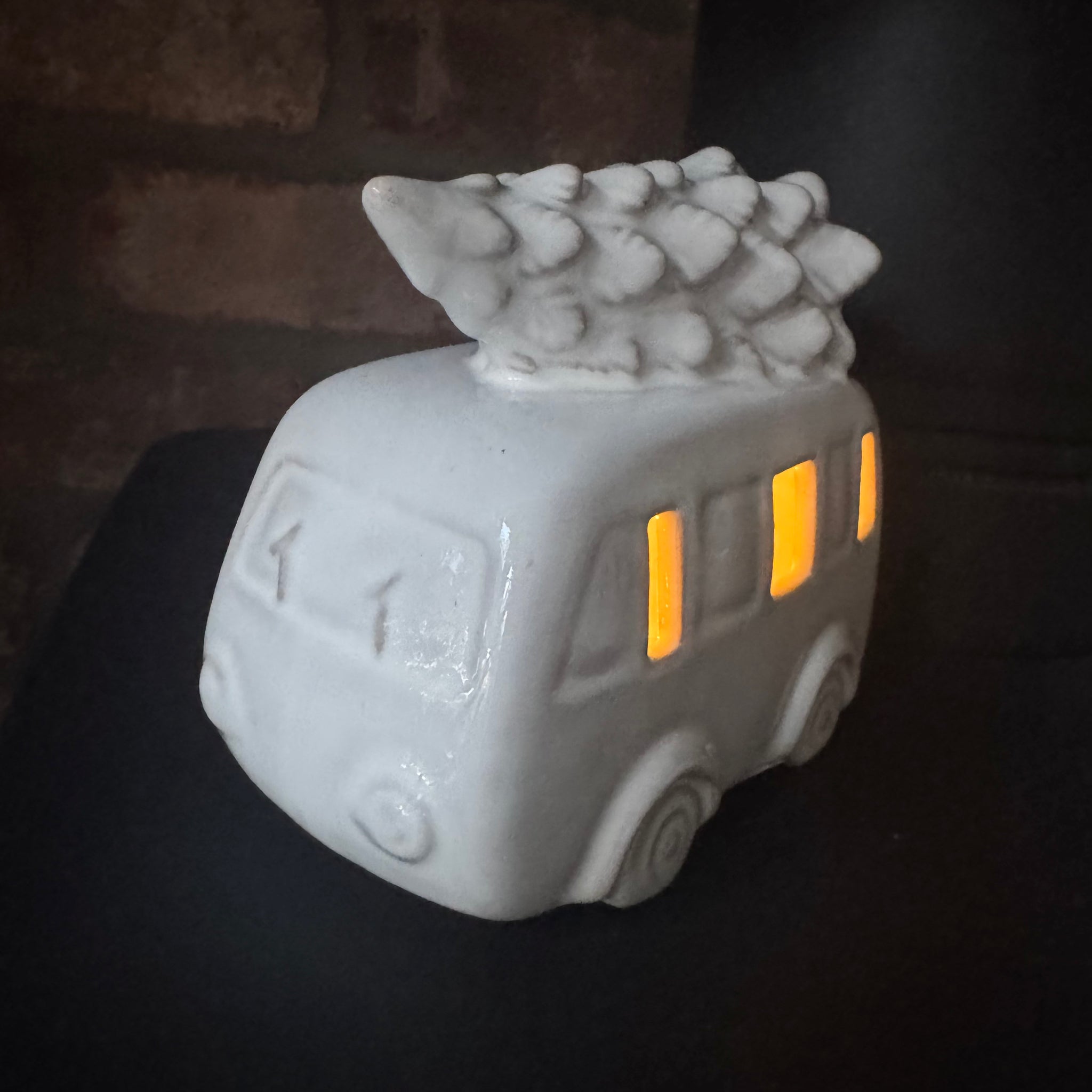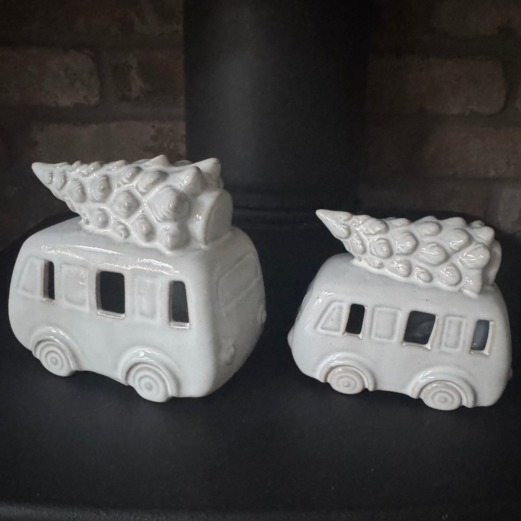 Neutral glazed Ceramic LED Campervan with christmas Tree on the roof