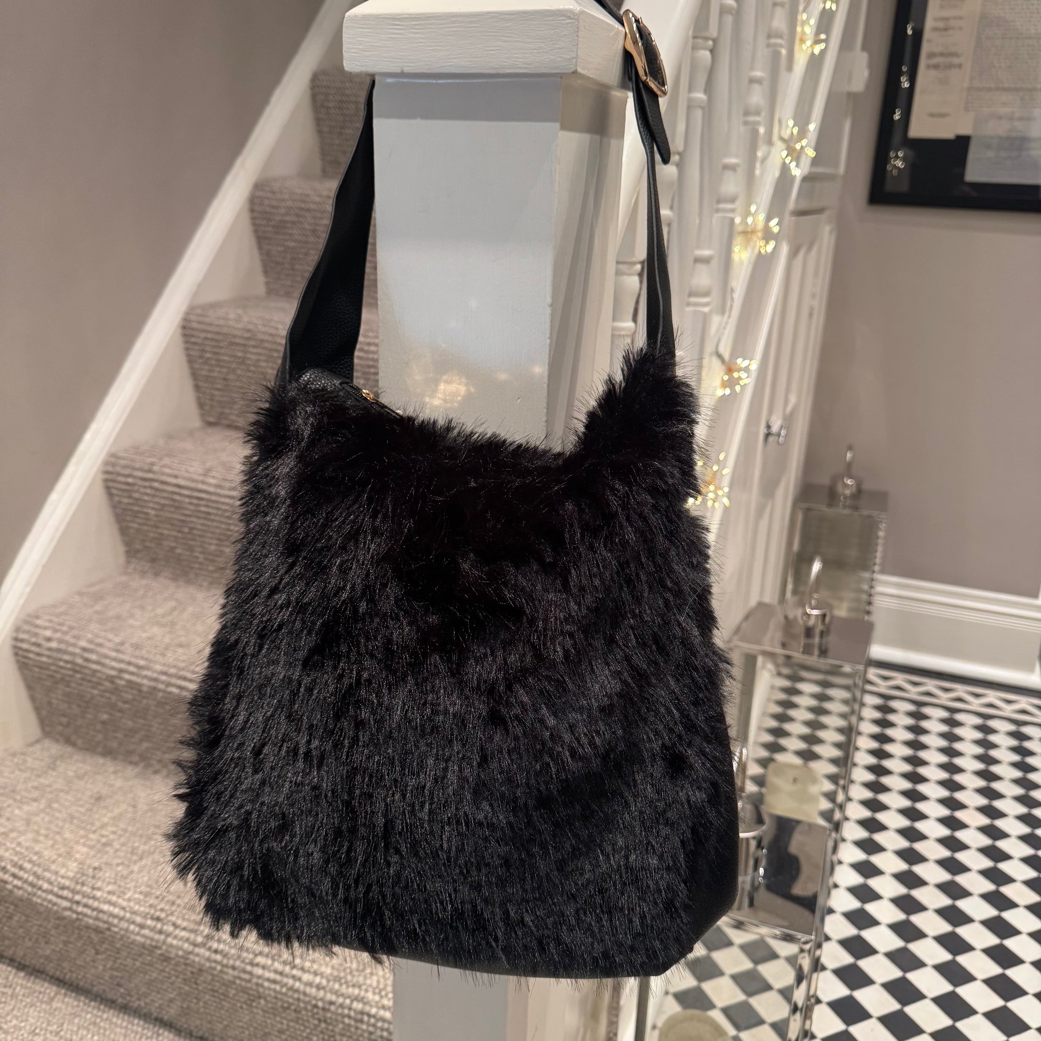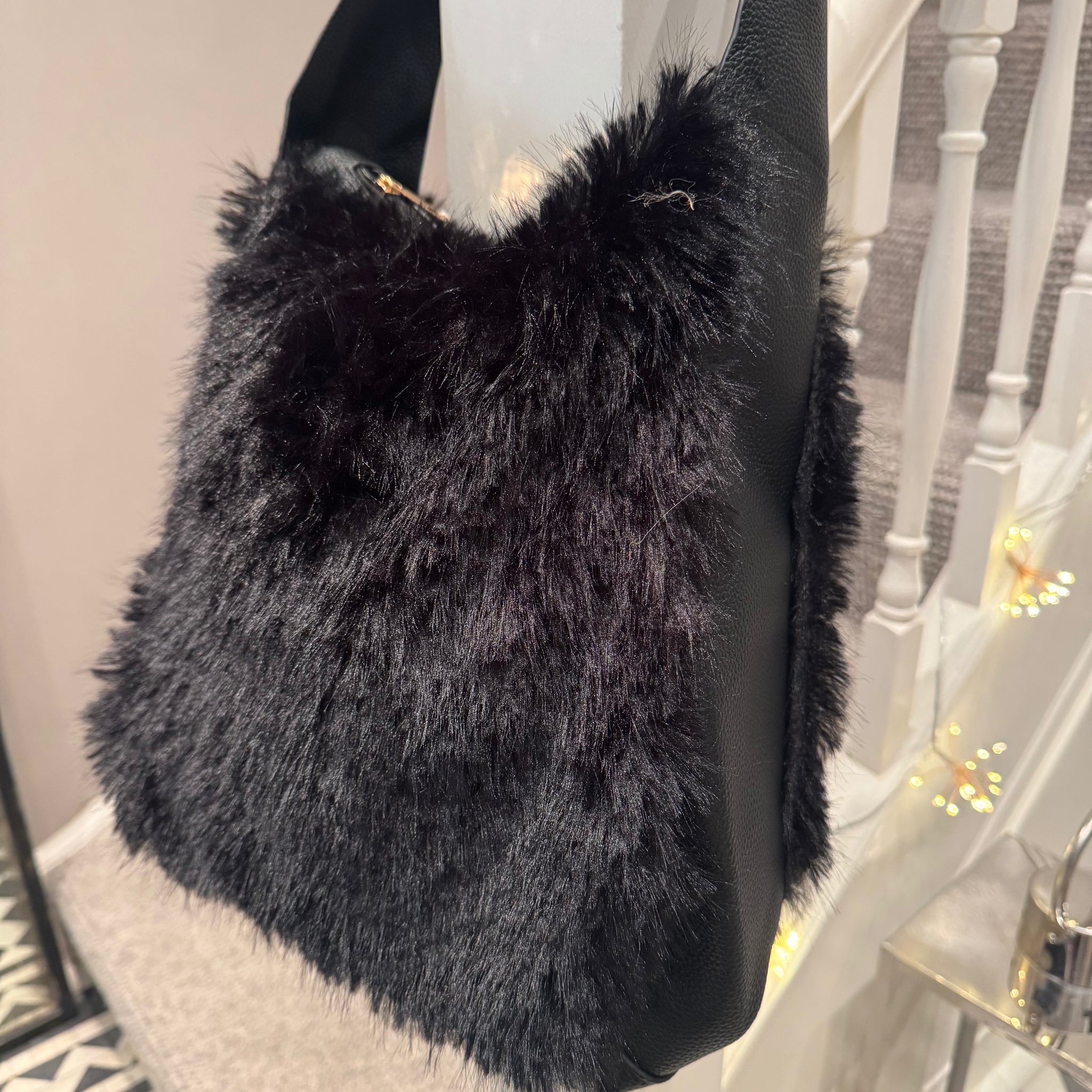Faux Fur Bag with leather detail & strap - Ebony Black