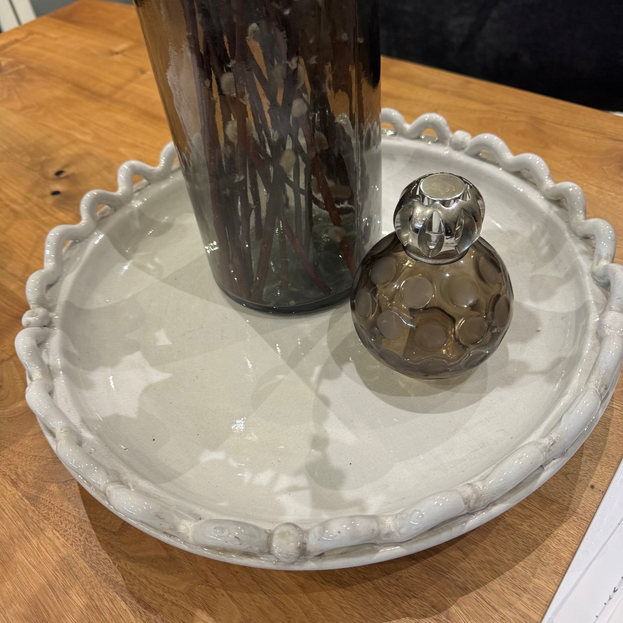 Timeless and stunning Plate with a wave detail running along the top detail that can be styled in many ways in any home. With a distressed, imperfect cracked finish in an off white.