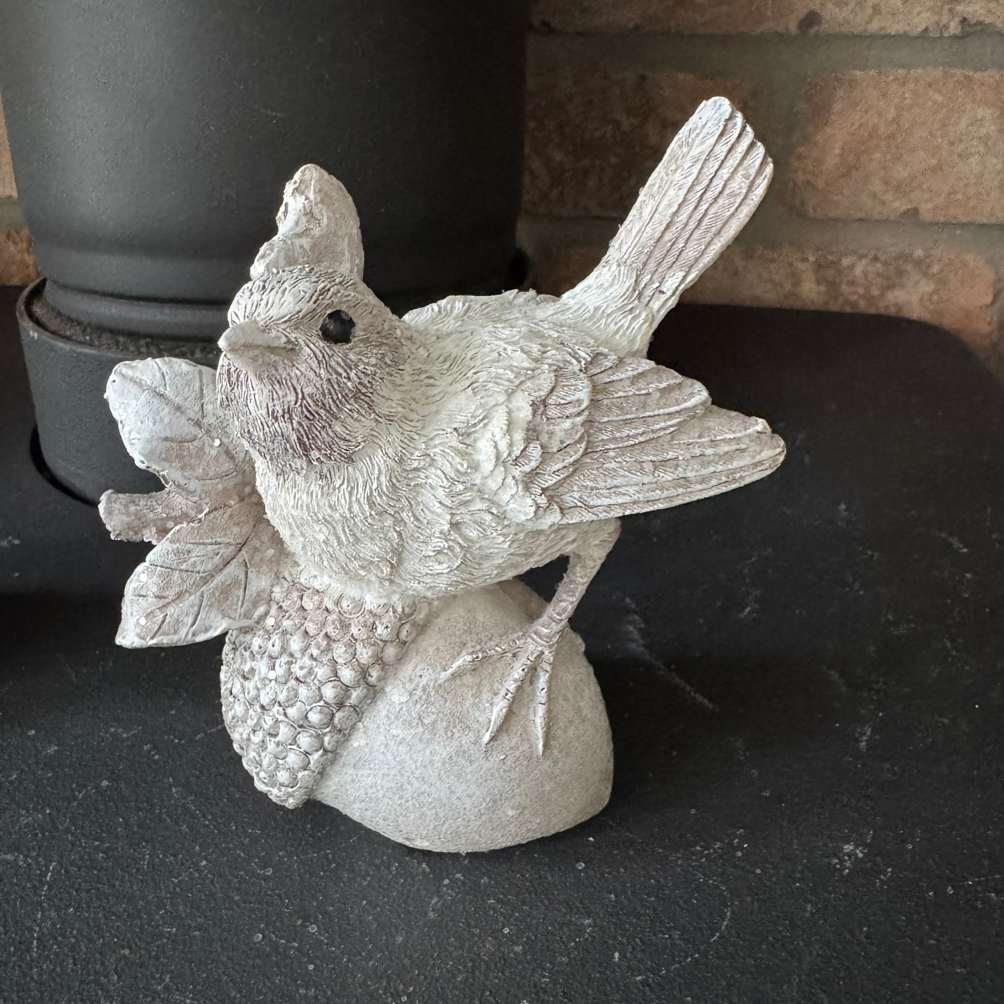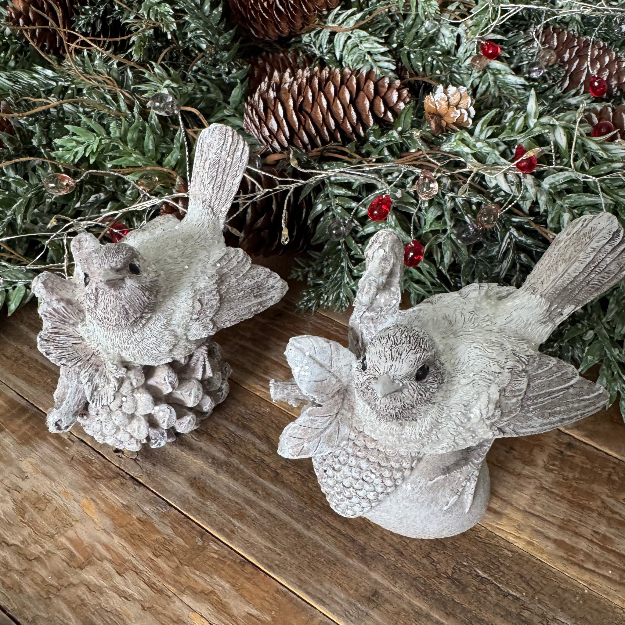 Sold separately - one is sittiing on an acorn and the other sat on a pinecone, each one would look adorable either standing alone on display or paired up together. Both birds are completed with a white and silver glistening finish.